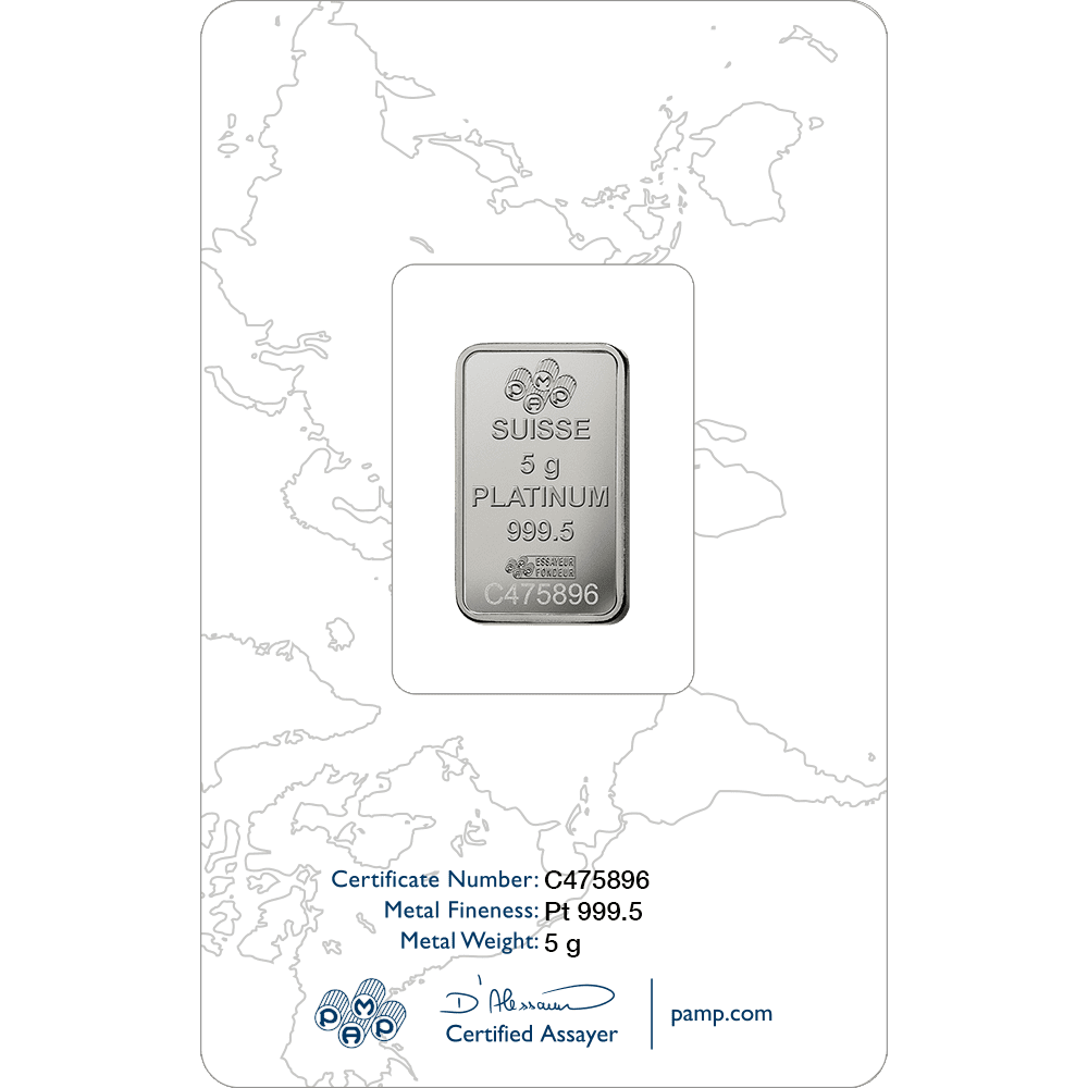 Each bar is individually sealed in a tamper-evident CertiPAMP™ assay card with certificate, which guarantees its authenticity, purity, and weight. Compact yet elegant, this 5-gram platinum bar is an ideal choice for collectors, first-time investors, or those seeking to diversify their precious metals portfolio with one of the rarest and most prestigious metals.