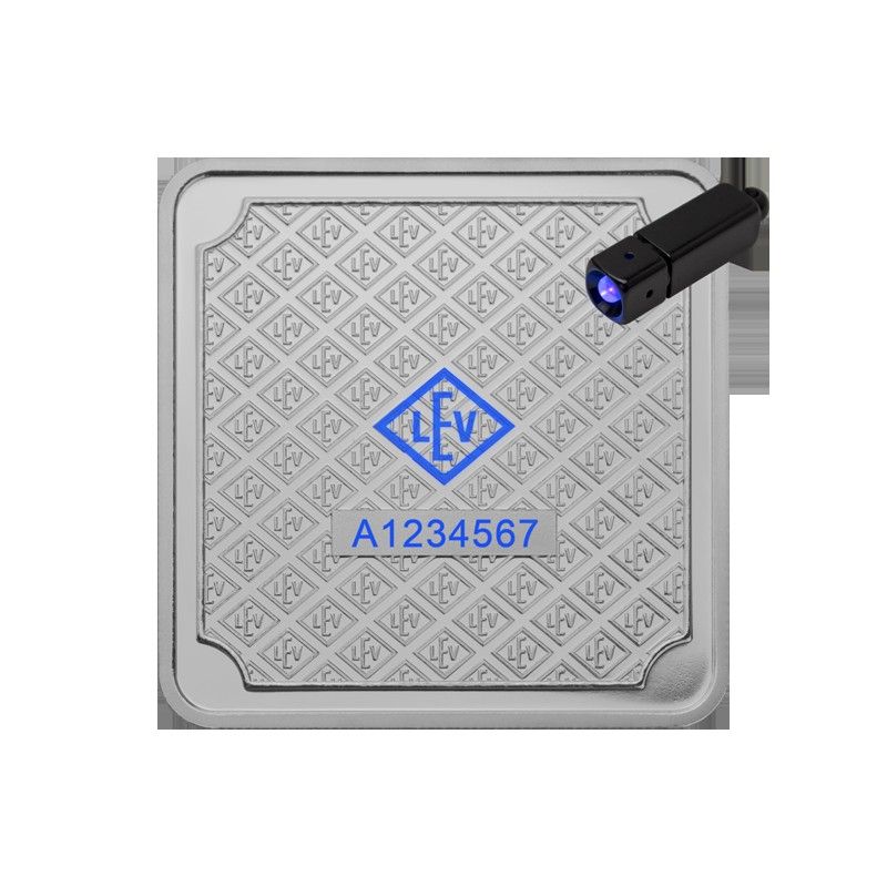 The reverse side of the bars have a pattern of the hallmark of our mint, the Leipziger Edelmetallverarbeitung (LEV). Furthermore, the reverse side has a blue coating with an individual serial number and another central placed hallmark. This blue coating has the special feature: it glows under UV light.