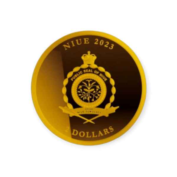 This amazing coin features a beautiful portrait of Queen Elizabeth II with selective colouring on the reverse side. The obverse side of the coin features the Public Seal Of Niue. It is inscribed with “Public Seal of Nuie” as the issuing country, “2 Dollars” the face value of the coin, and “2023” the year of issue.